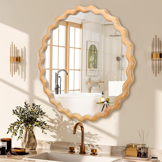27.5" Round Wavy Bathroom Wall Mirror with Whitewash Edge, Wooden Farmhouse Circle Vanity Mirror - PAIHOME