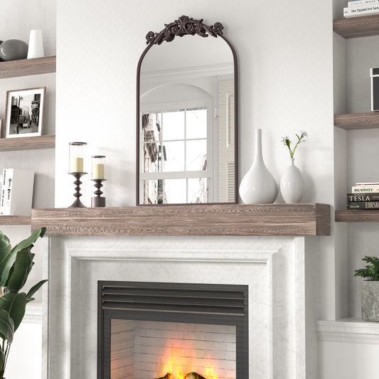 PAIHOME Brown Arched Mirror, Vintage Wall Mirror for Bathroom, Antique Fireplace Mirror, Carving Baroque Top Decor