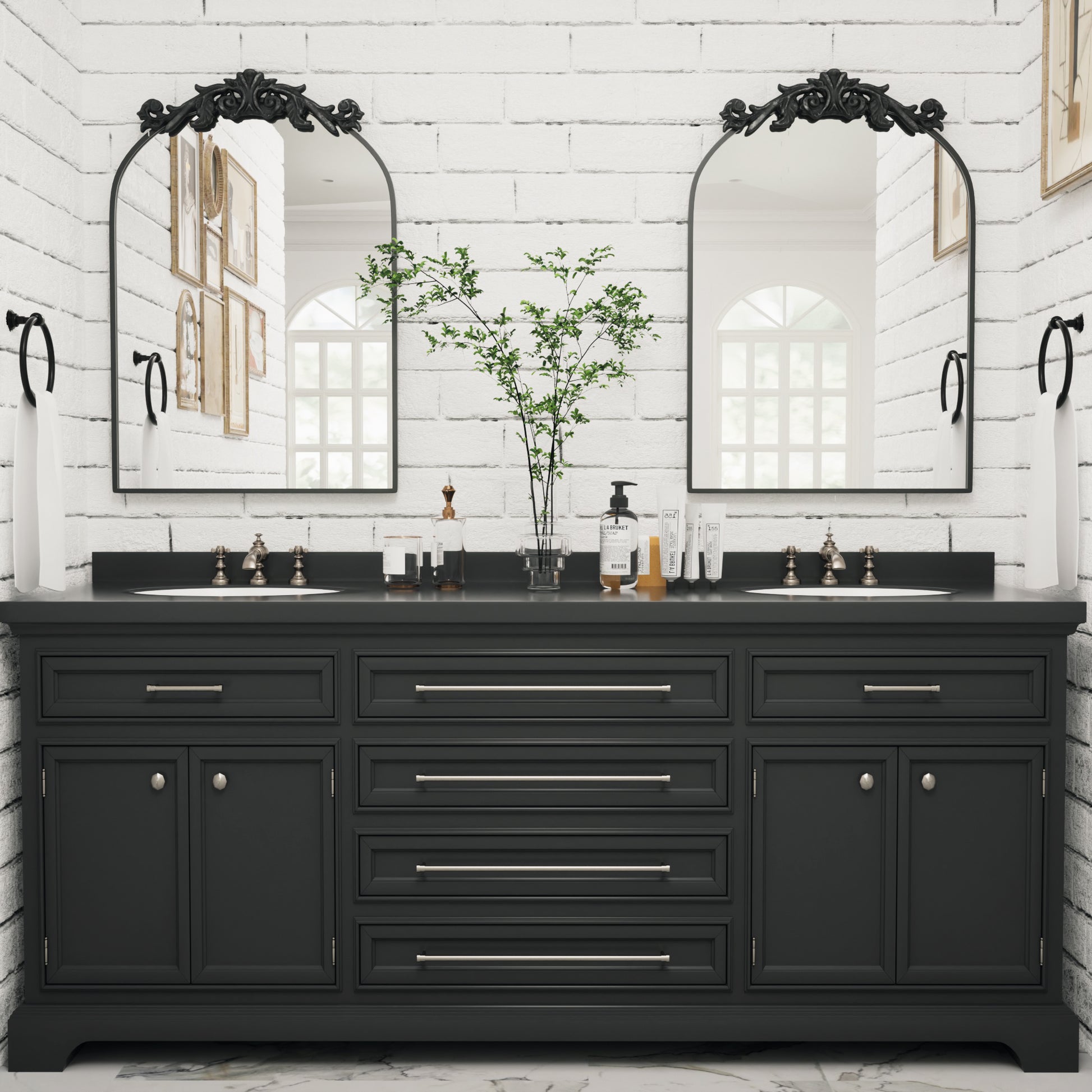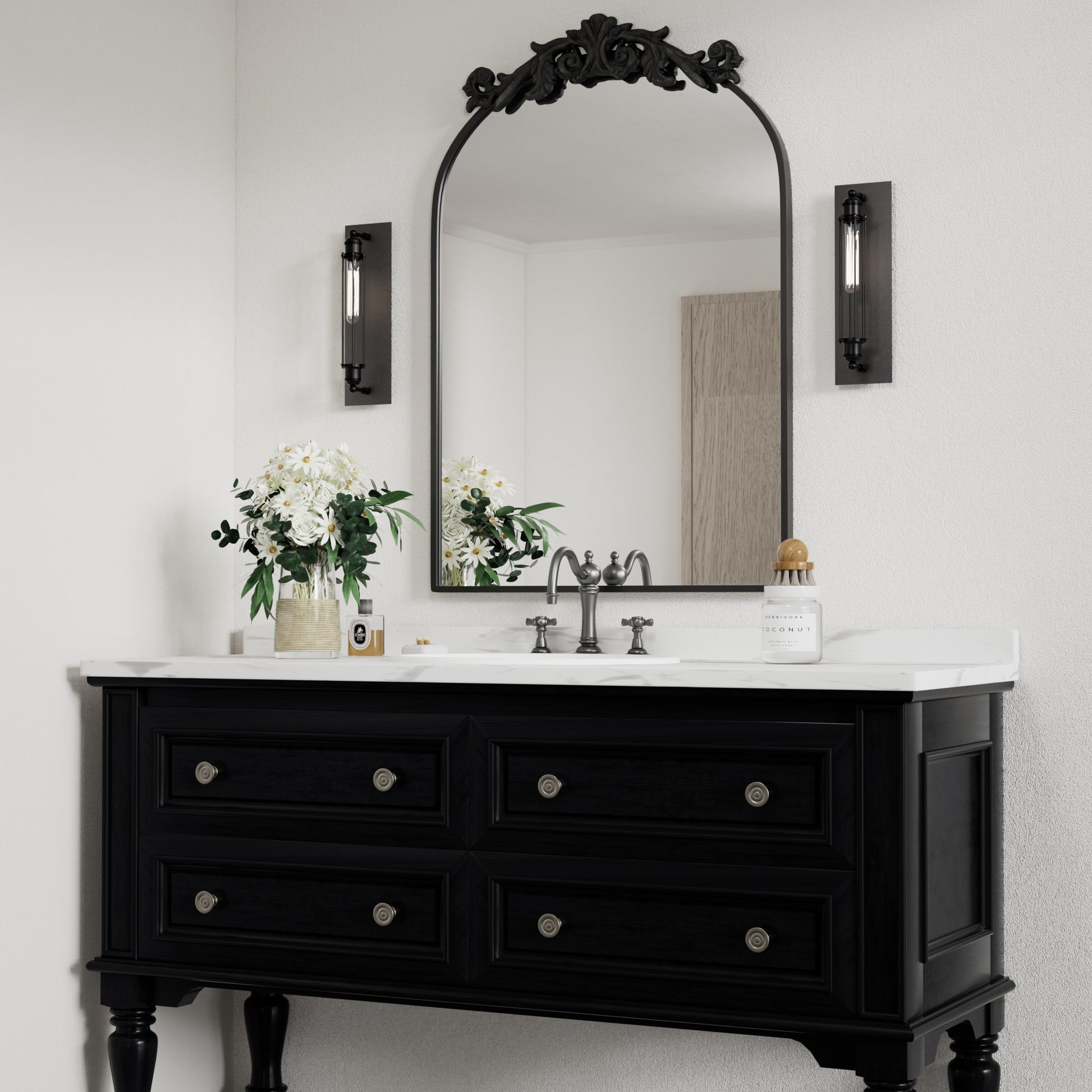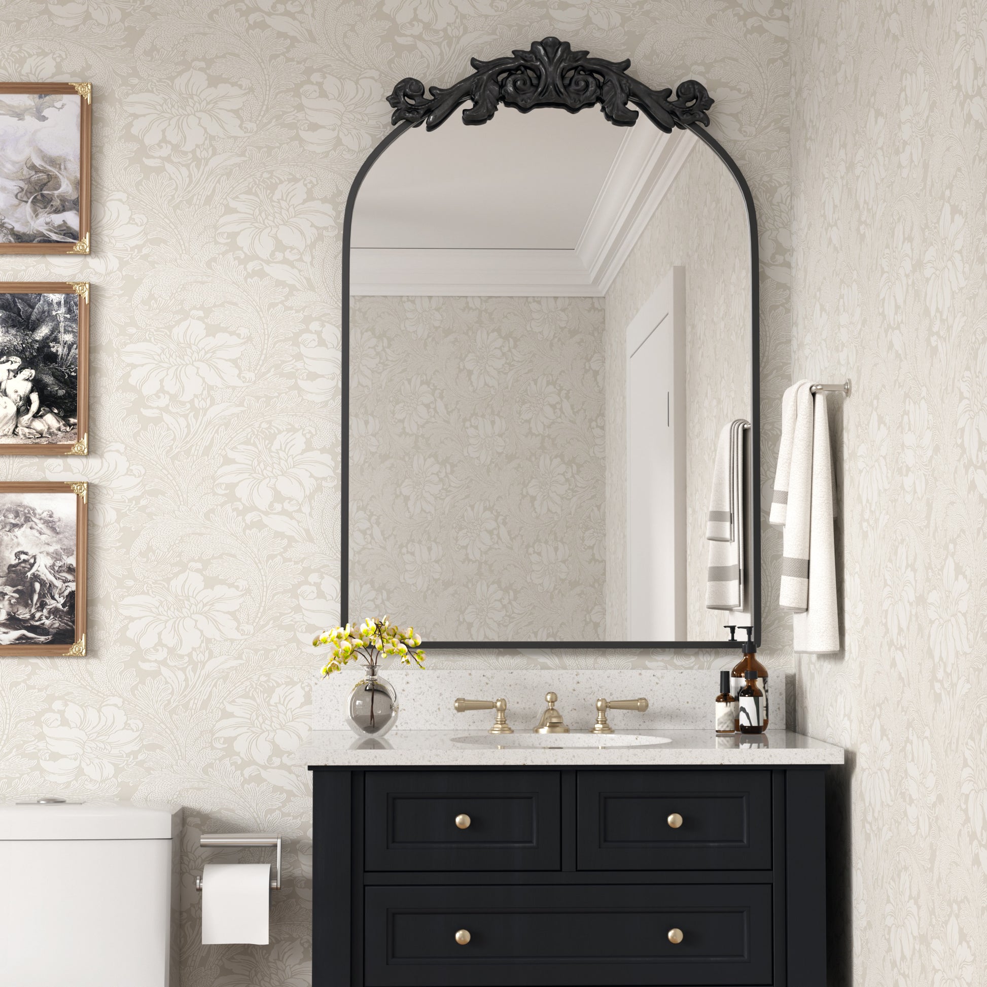 PAIHOME Vintage Arched Wall Mirror for Bathroom, Black Antique Mirror with Top Carving, Halloween Decorative Wall Mirror