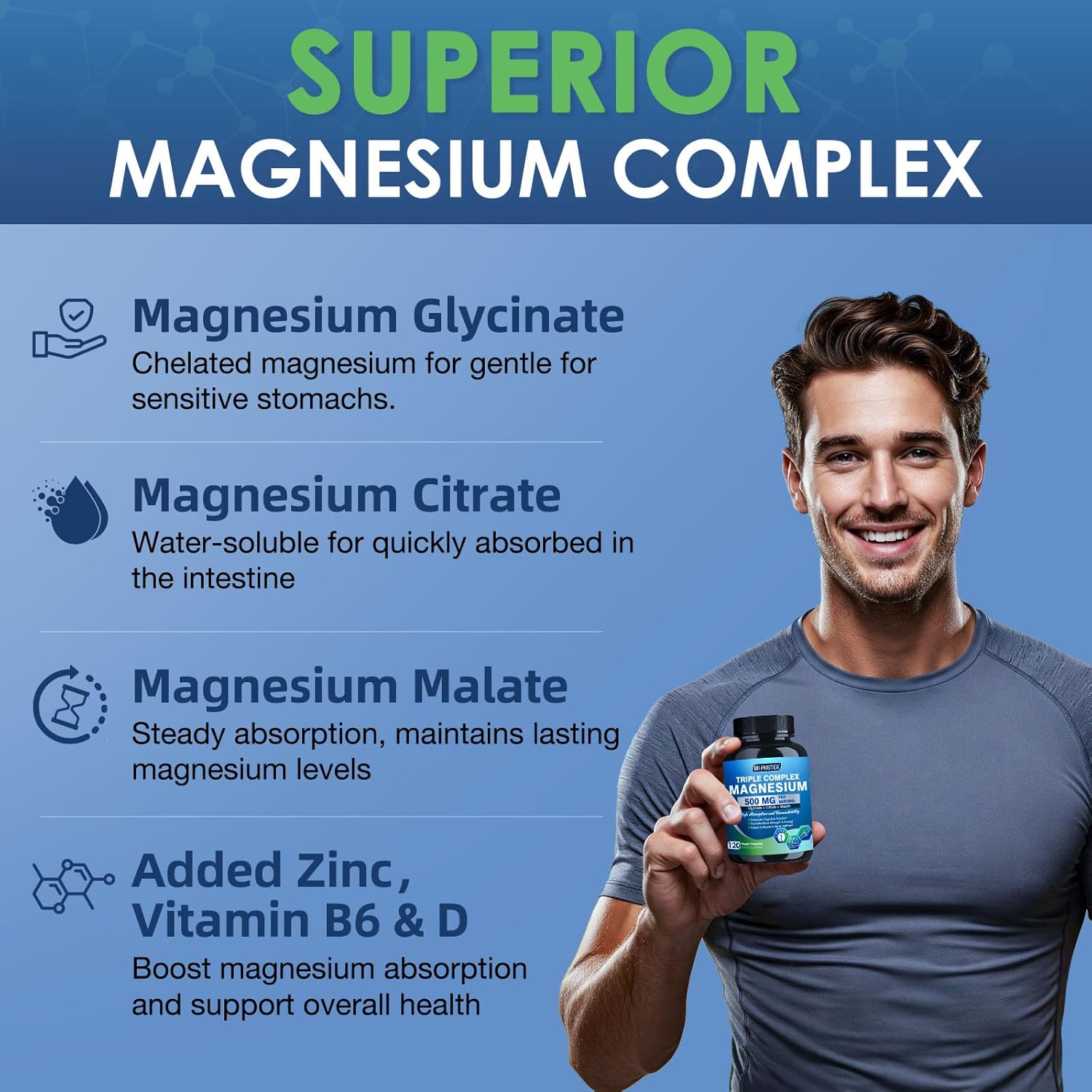 Support your body's essential functions with this comprehensive magnesium complex formula. Each capsule delivers 500mg of highly absorbable magnesium from three premium forms—glycinate, citrate, and malate—combined with zinc and vitamin D for synergistic benefits. This advanced blend targets brain clarity, bone density, and muscle function, making it ideal for both men and women seeking optimal wellness. Our vegan capsule formula contains 120 servings of scientifically-formulated nutrition designed for maximum bioavailability and gentle absorption. Experience the difference quality supplementation can make in your daily vitality and long-term health.