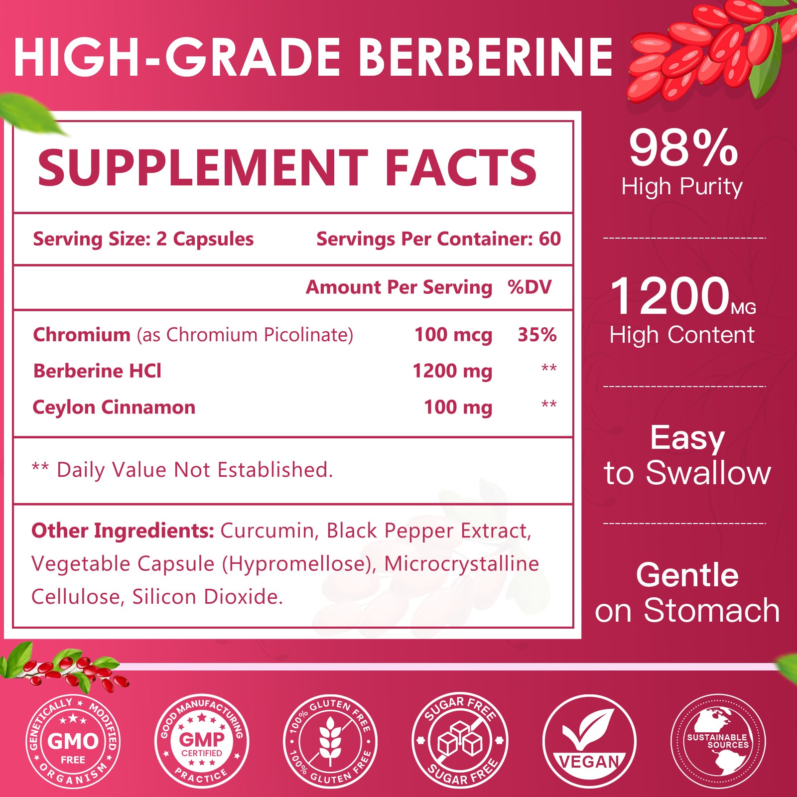 NATURE TARGET Berberine HCl delivers a potent 1200mg dose combined with Ceylon Cinnamon and Chromium to support digestive health, immune function, and gastrointestinal wellness. This comprehensive formula harnesses berberine's natural ability to promote healthy glucose metabolism and support beneficial gut bacteria. Ceylon Cinnamon enhances the blend with additional metabolic support, while Chromium helps maintain balanced nutrient absorption. Each bottle contains 120 vegetarian capsules of non-GMO ingredients, formulated without artificial additives. Ideal for those seeking targeted nutritional support for digestive comfort and overall wellness.