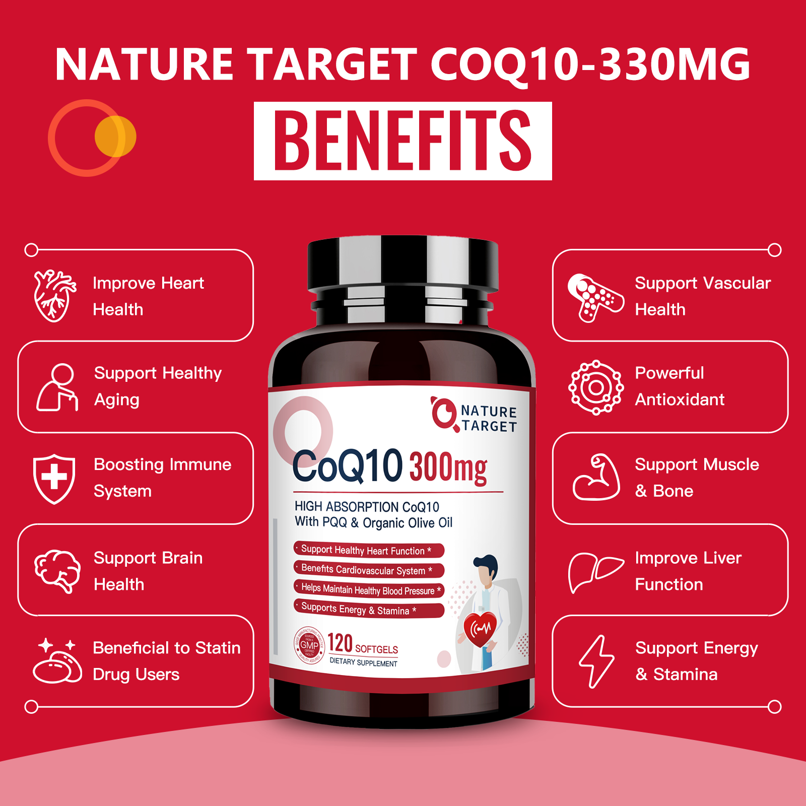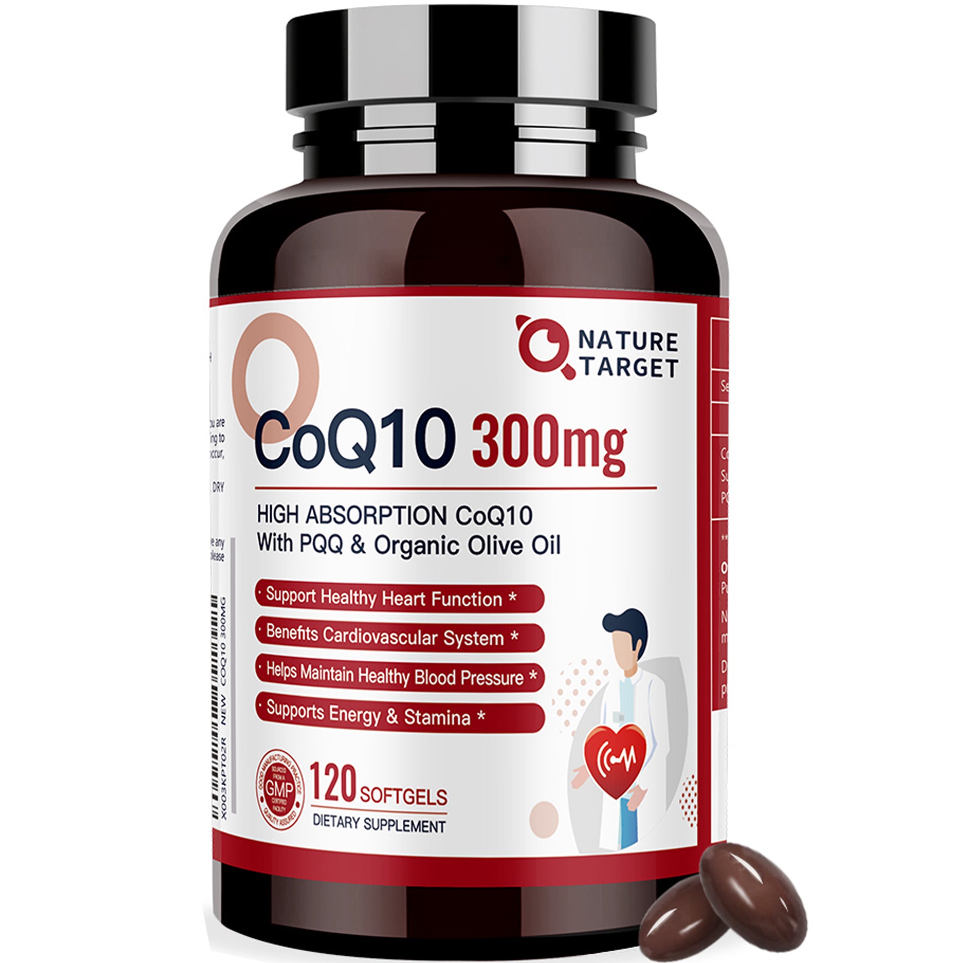 Nature Target CoQ10 300mg+PQQ, Olive Oil, High Absorption, Heart & Immune Support, Energy Production - 120 Servings