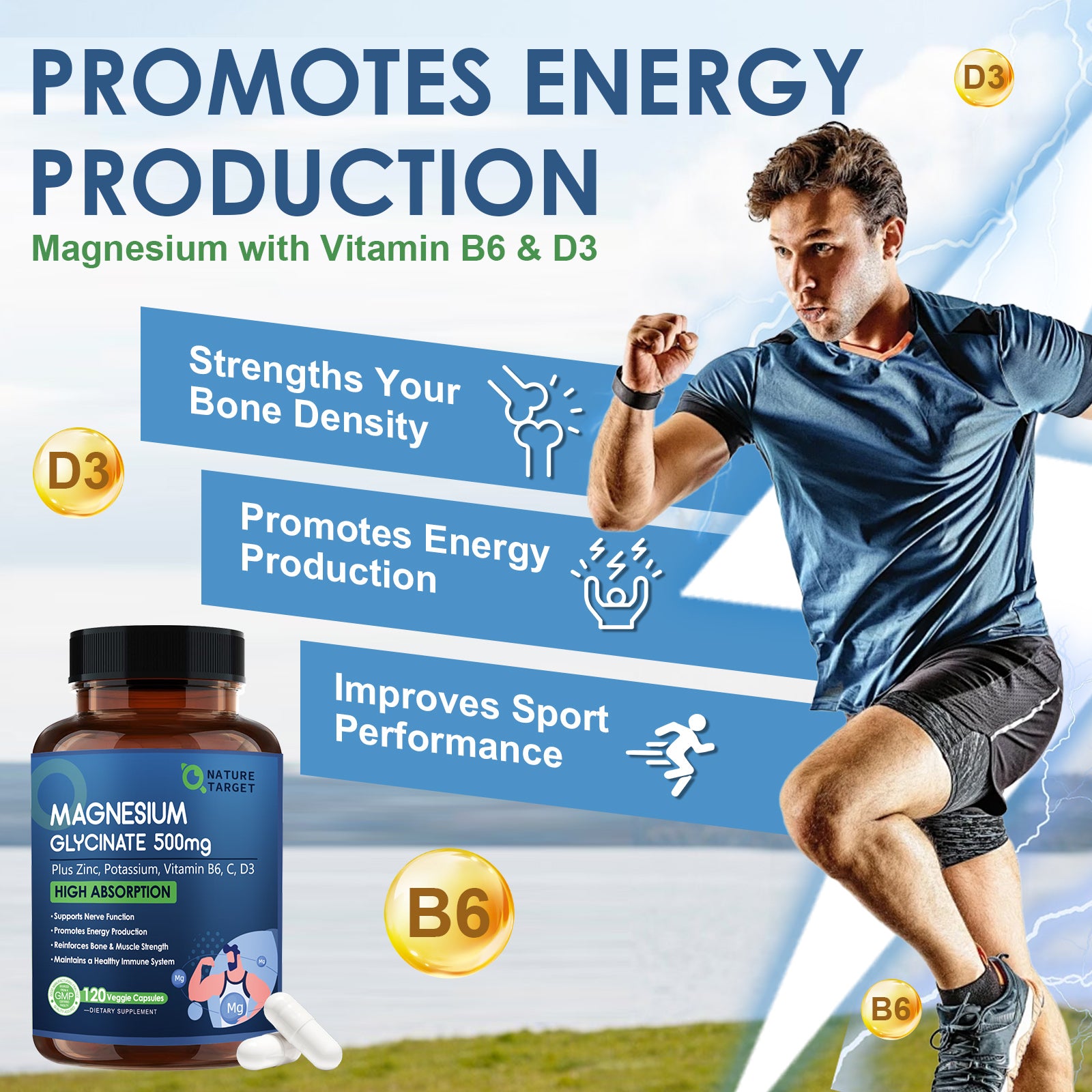 - High Potency Formulated: Nature Target magnesium glycinate capsules provides 500 mg per serving, plus zinc, potassium, vitamin B6, C, D3 with superior absorption and bioavailable, their combination supports your muscle, bone, immune and energy level achieve optimal condition. Fully reacted, non-buffered magnesium capsules are gentle on stomach.