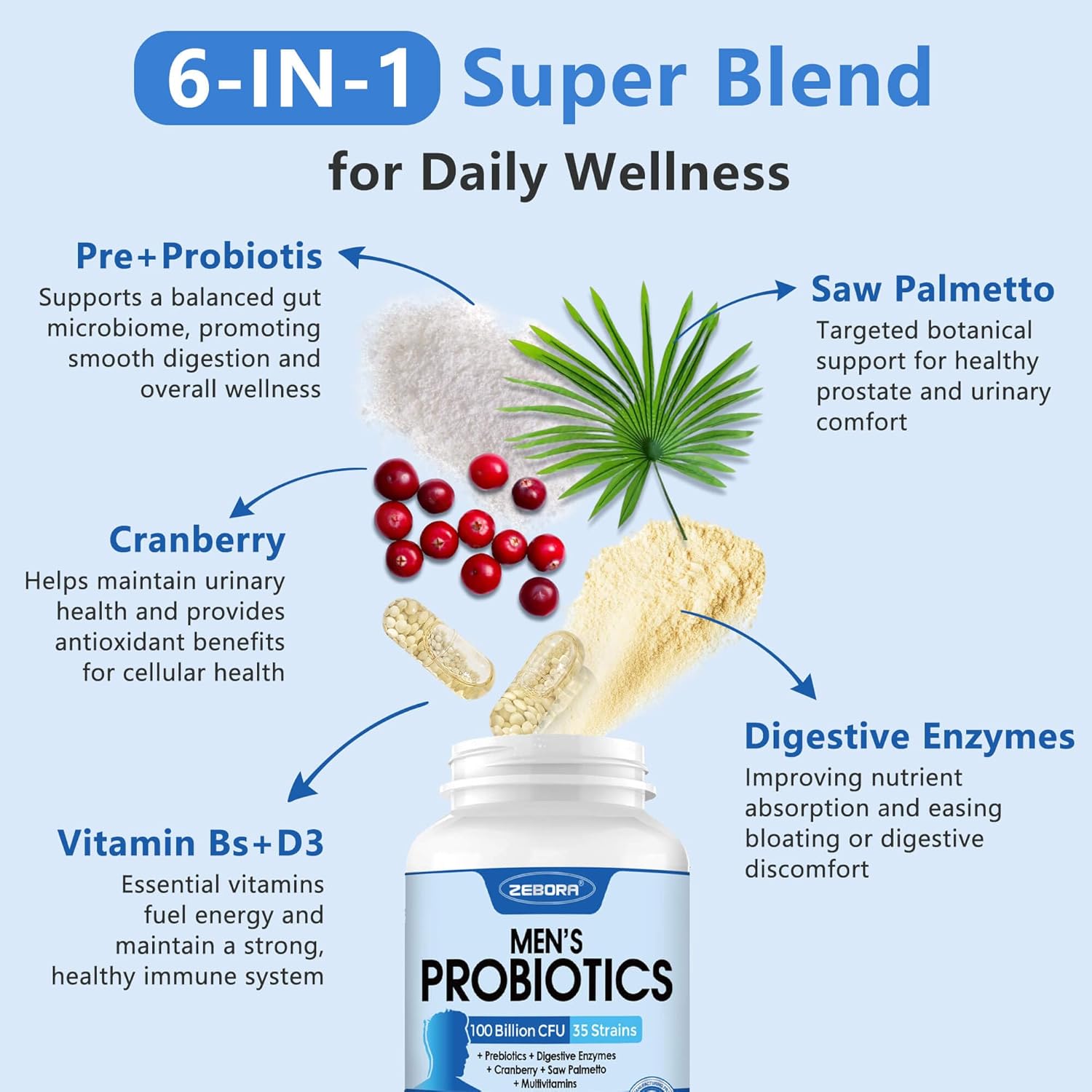 ZEBORA Probiotics for Men 100 Billion CFU - Probiotics & Prebiotics & Enzymes - 90 Veg Capsules